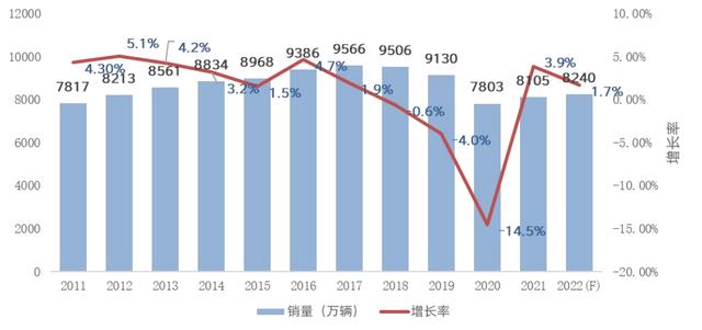 从全球汽车销售来看,2018 年全球汽车销量下降 1%,是 2010 年以来首次出现年度负增长,2019 年全球汽车销量为 8981 万辆,同比再次下降 4%,2020 年由于新冠疫情下滑幅度则扩大至 13%。不过,在全球汽车销量一片低迷之中,中国车市销量相对稳定。